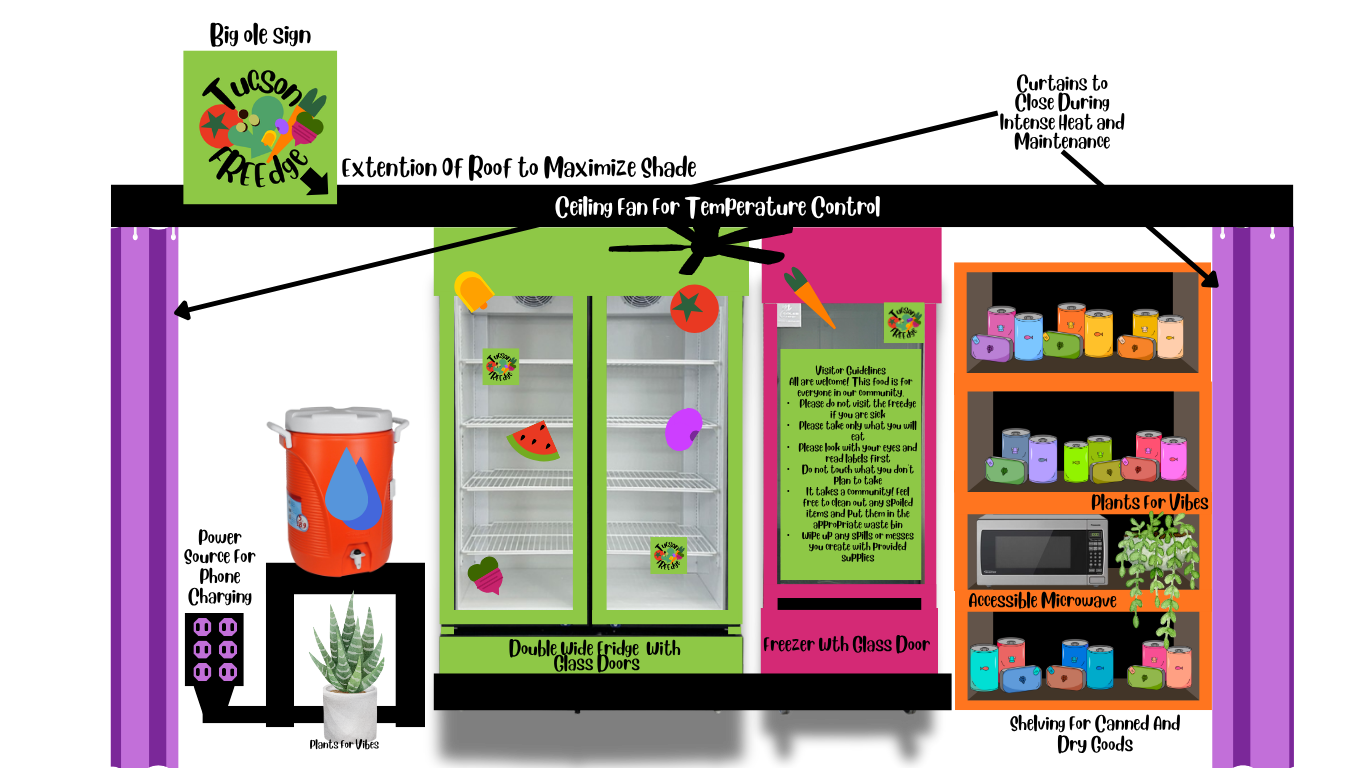 The Tucson FREEdge is a community fridge project—anyone who needs food may grab it from the FREEdges at any time, and anyone may share food through the FREEdges by just leaving it in the appropriate amenity (Fridge, Freezer, or Shelving). Assisting in our daily/weekly cleanup, or putting some $$$ towards the project are also wondeful ways anyone can contribute to this project!